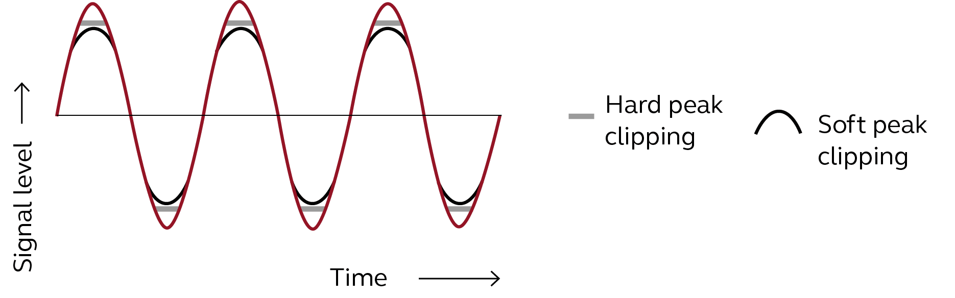 Proporciona una relación de compresión de 1:1, que para los sonidos entrantes suaves y fuertes establece el mismo objetivo de ganancia que para los sonidos moderados. En este modo, el recorte de picos suaves y el de picos fuertes son opciones de saturación para limitar los sonidos reproducidos en los audífonos. Aunque ambas opciones crean más distorsiones en la salida de los audífonos (especialmente el recorte de picos fuertes), hay usuarios con hipoacusia severa o profunda que las prefieren.