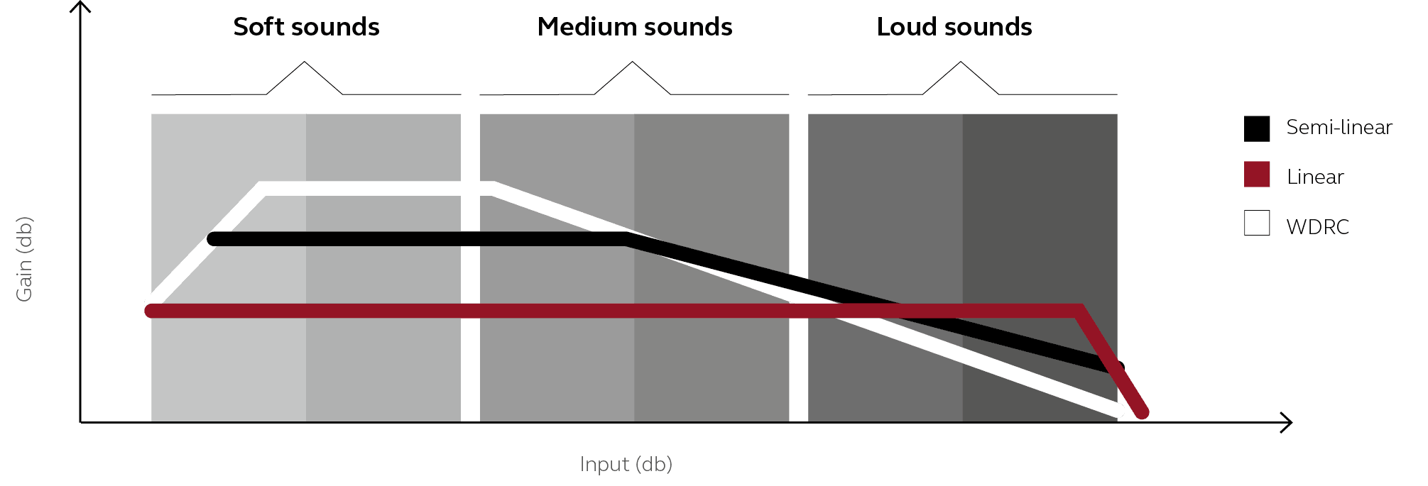 Réduit les taux de compression prescrits par la cible de réglage sélectionnée en réduisant le gain pour les entrées faibles et en augmentant le gain pour les entrées fortes. Les modes WDRC et semi-linéaire utilisent tous deux la limitation de compression pour contrôler la sortie maximale pour la distorsion la plus faible (que préfèrent le plus souvent les porteurs d'aides auditives).